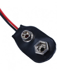 9V wired clip battery connector, features faux leather shell, 2-wire connector, black red in color.